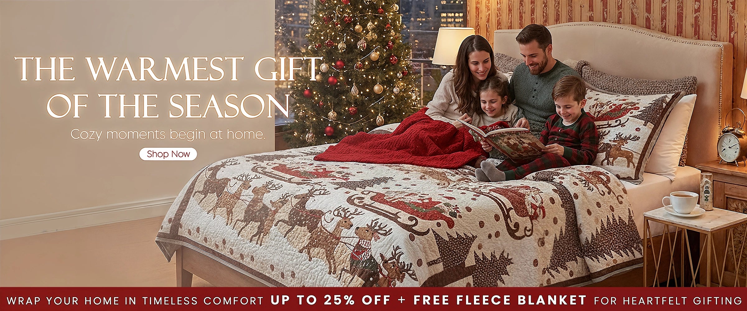 Pajabear Quilt 3-Piece Set Cozy Santa Claus With Reindeer Pulling His Sleigh Full Of Gifts