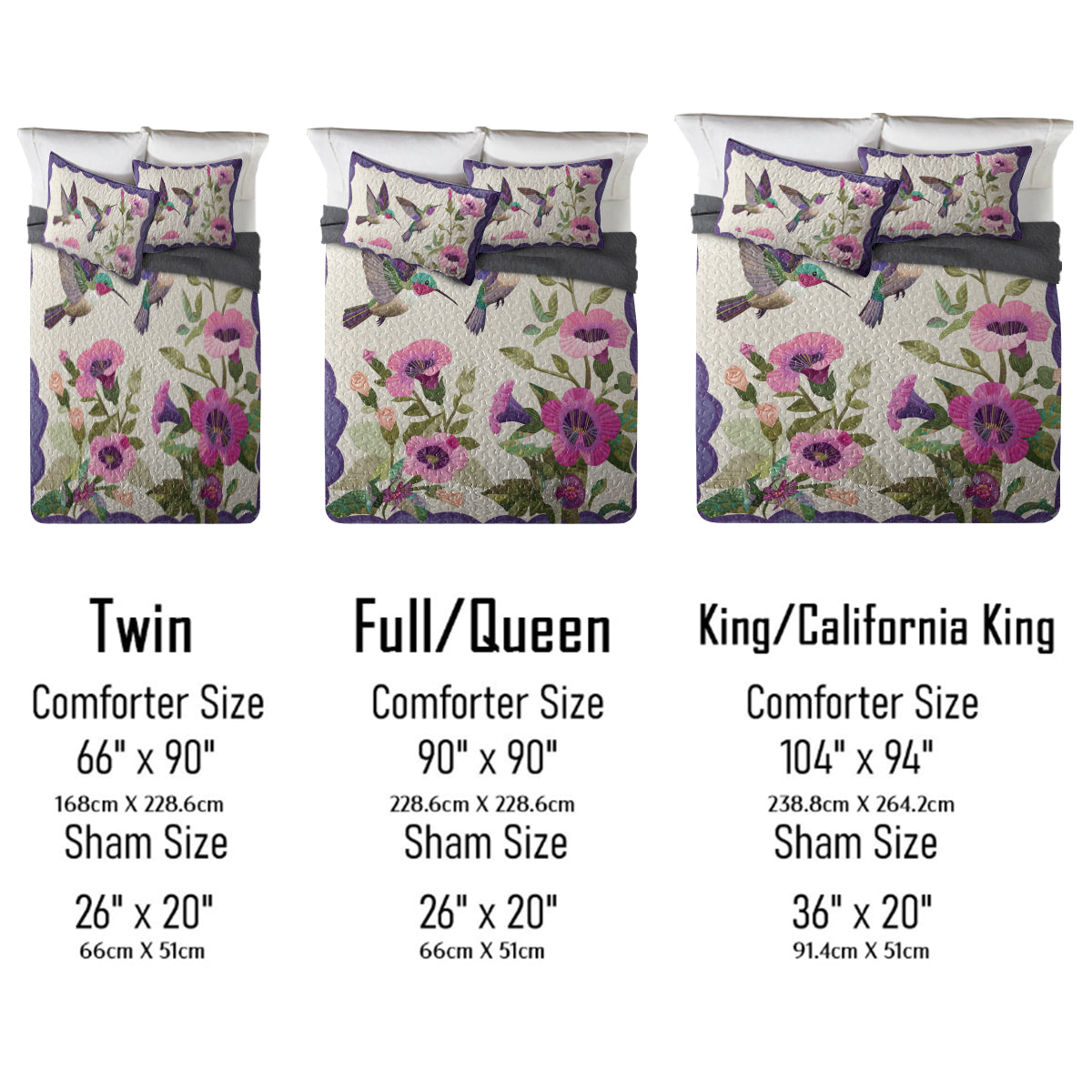 This quilt set captures the graceful charm of nature with vibrant hummingbirds fluttering among delicate florals and lush greenery. The soft watercolor tones of green, lilac, and cream create a serene, timeless atmosphere. Each detail—from the fluttering wings to the blooming petals—evokes a sense of peaceful elegance and natural harmony, perfect for a restful bedroom retreat.