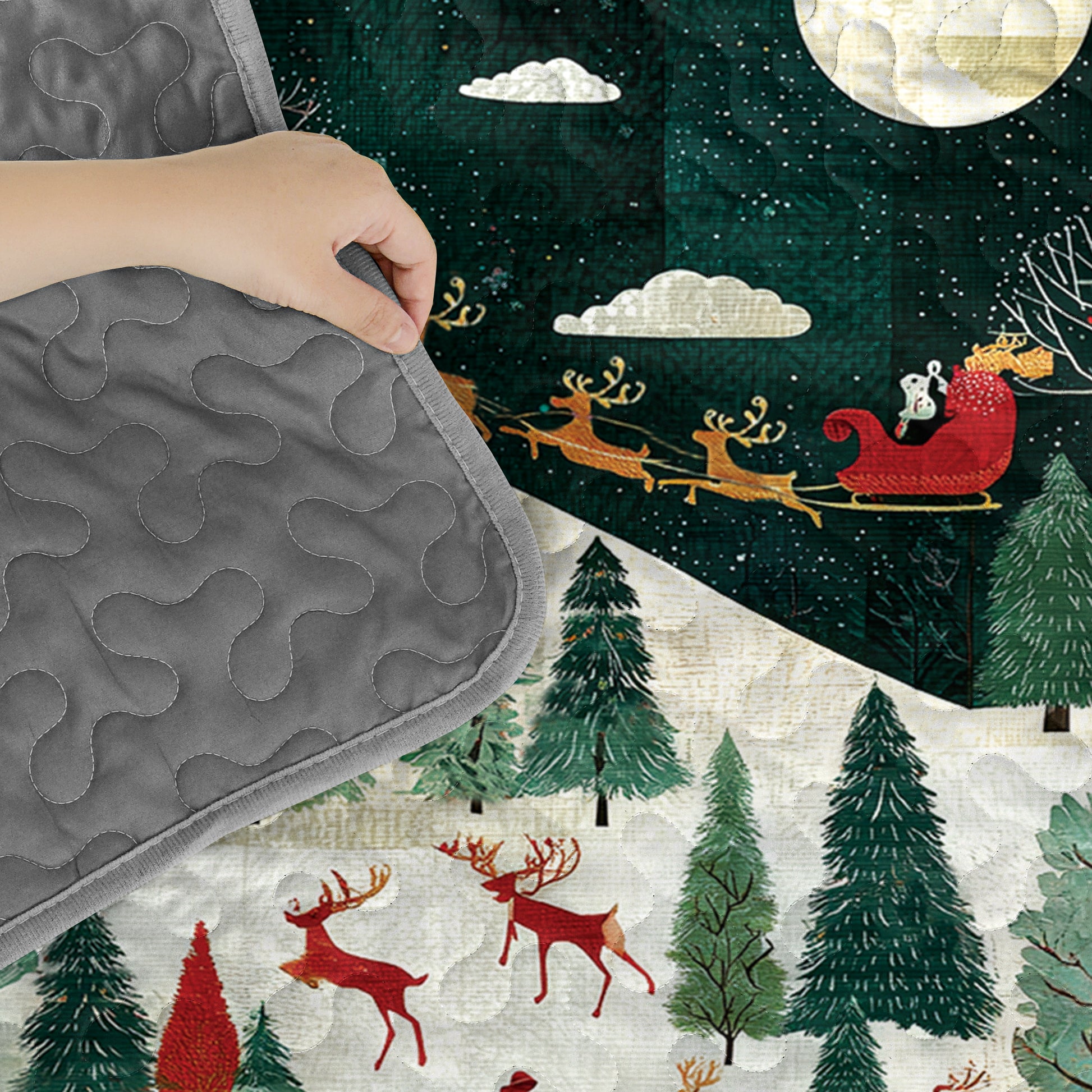 Bring the peaceful beauty of a winter’s night into your home with the Christmas Eve Magic Quilt Set. Featuring Santa’s sleigh gliding under a moonlit sky and reindeer wandering through snowy evergreens, this design evokes calm, nostalgia, and wonder. Crafted with rich colors and soft textures, it transforms your room into a serene Christmas escape — where dreams drift as gently as falling snow.
