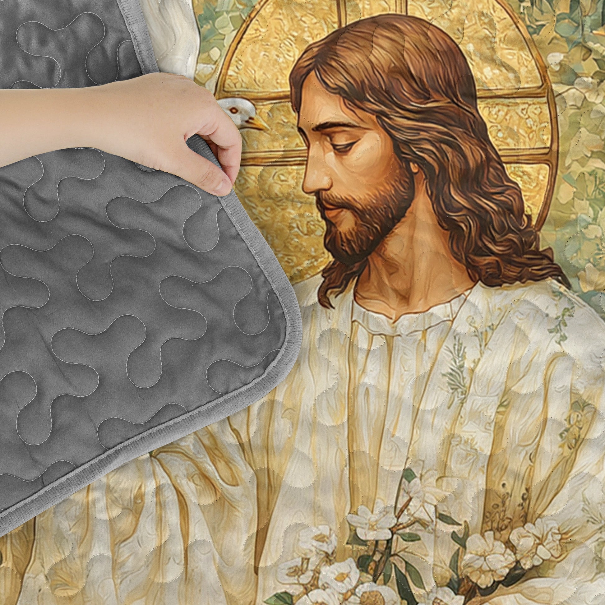 This piece captures the sacred moment as the dove—symbol of peace and the Holy Spirit—descends upon Him amidst blooming white flowers, under the gentle radiance of a golden halo. Every petal and beam of light reflects divine purity and renewal.