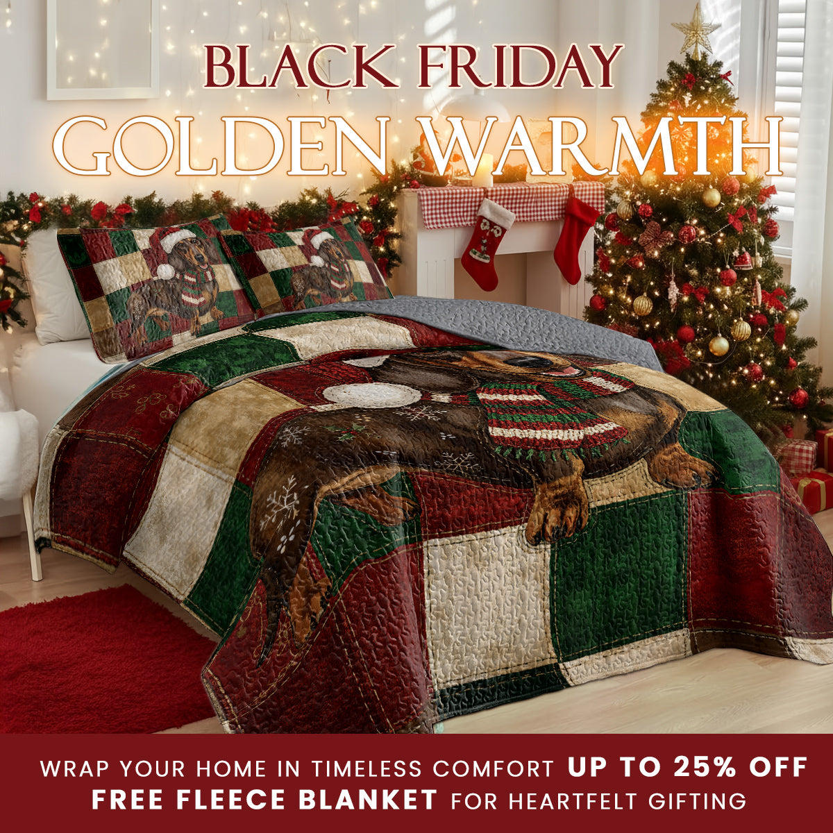 Our Festive Wiener Quilt Set is crafted for dog lovers who can’t resist a warm, festive touch in their bedroom. The patchwork design blends rich holiday colors — red, green, and cream — with an adorable dachshund wearing a Santa hat and scarf, adding instant joy to your winter décor.