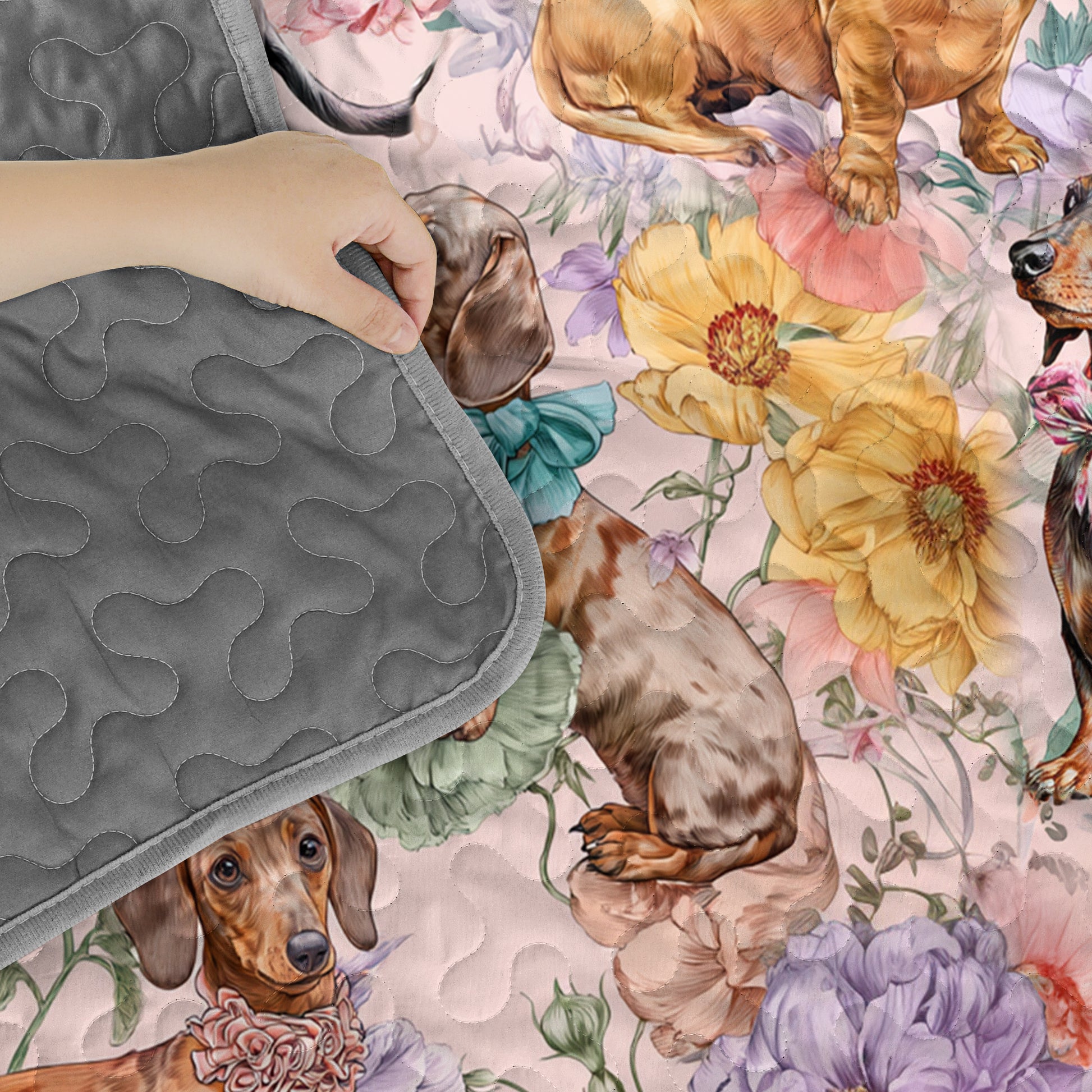 This quilt set captures the joyful charm of dachshunds surrounded by a lush garden of pastel blooms. Each pup, adorned with playful bows, adds a touch of whimsy and warmth. The soft floral background enhances the cheerful mood, making this design perfect for those who love both elegance and a hint of fun.
