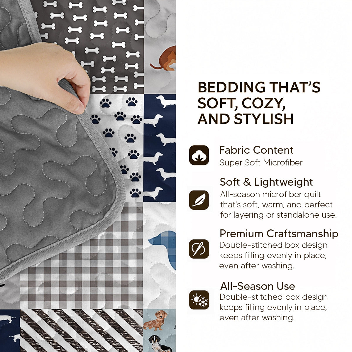 All-Season Comfort: Designed for year-round use, this quilt set offers the perfect balance of warmth and lightness. With a heavier-than-average microfiber filling wrapped in a polyester shell, it provides just the right amount of weight—keeping you cool on warm summer nights and offering cozy warmth during chilly winter evenings