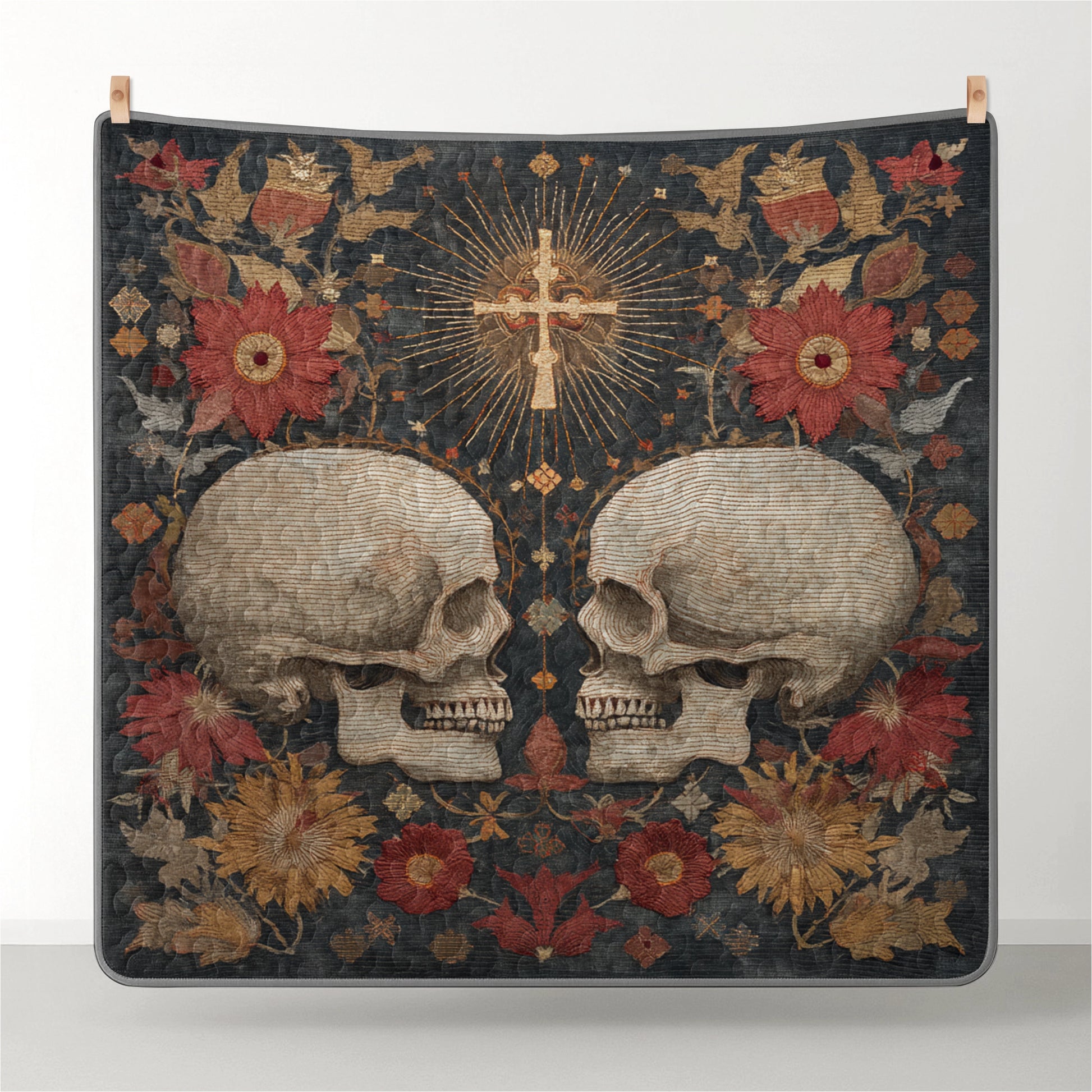 This design features two mirrored skulls surrounded by aged florals and baroque detailing, all crowned by a radiant cross glowing above them — a powerful reminder of life, death, and the sacred stillness that lies between.