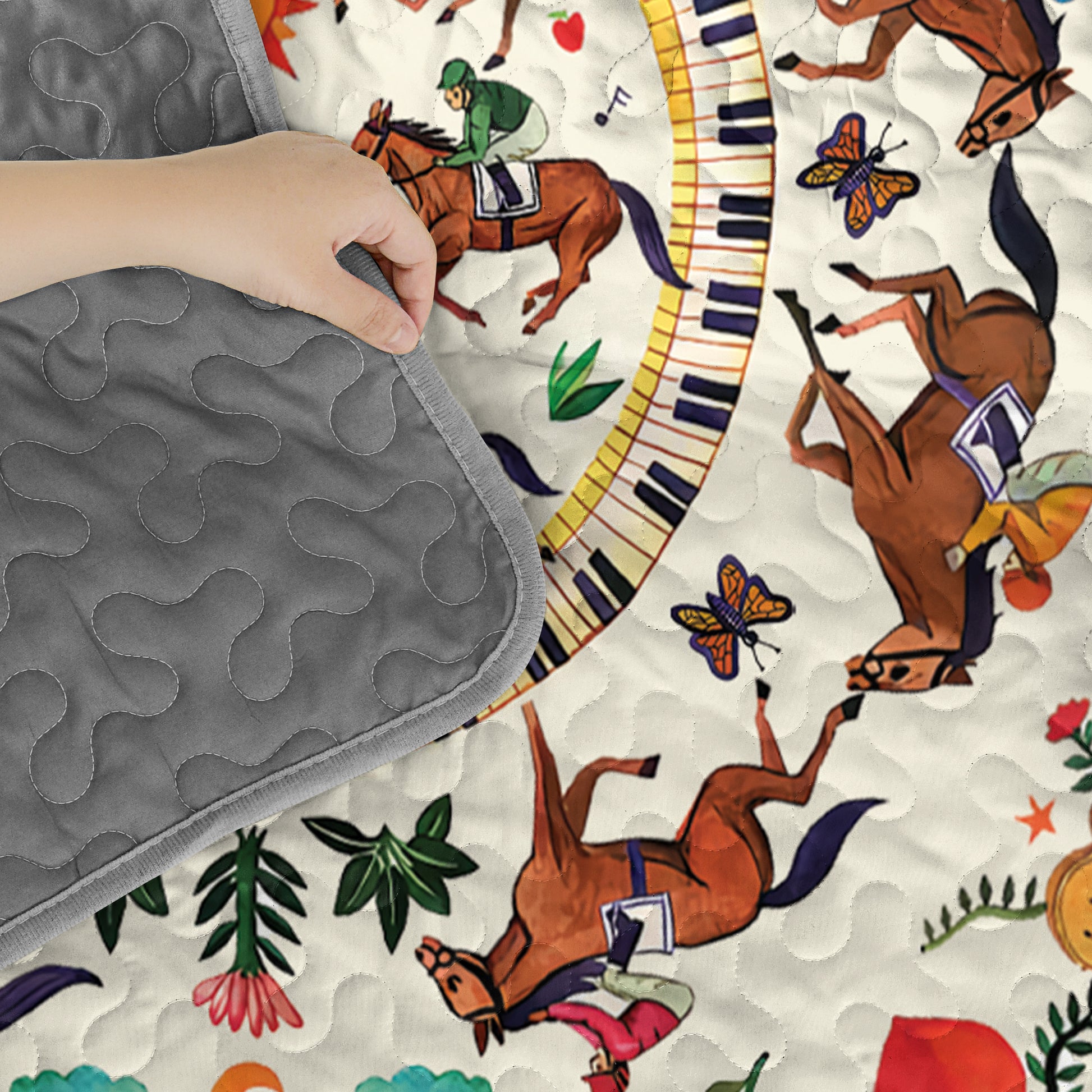 The design of The Carousel of Dreams Quilt is inspired by the joyful rhythm of life, where motion, color, and imagination blend into harmony. The galloping horses symbolize freedom and energy, while the circular piano keys evoke the timeless connection between music and movement. Surrounding motifs of butterflies, guitars, and blooming flowers represent creativity and renewal. This quilt captures the essence of celebration — a dance of art, nature, and melody woven into every stitch.